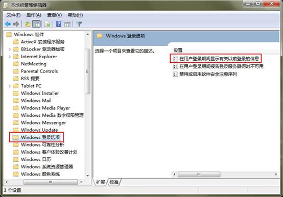 2、打开本地组策略编辑器后,依次展开“计算机配置—管理模板—windo组件—Windows登录选项”,然后鼠标双击右侧的“在用户登录期间显示有关以前登录的信息”,如下图所示: