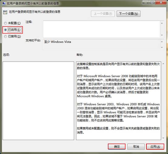 3、打开“在用户登录期间显示有关以前登录的信息”窗口后,选择“已启用”选项,最后点击“应用—确定”,如下图所示: