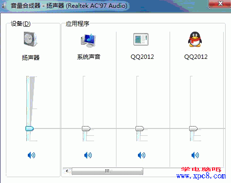 其实微软可能也注意到了这一点,Win7特意为用户设计了声音合成器管理,通过声音合成管理,我们可以随意的调整各个软件、系统的声音输出大小。