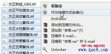 找到你的字库文件夹,选择(可以选择某个字体或者多个字体)后,单击鼠标右键,选择“作为快捷方式安装(S)”即可。