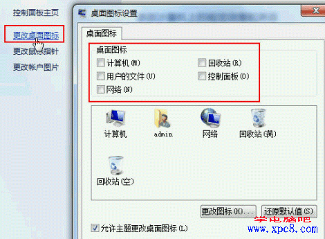 然后选择“更改桌面图标”,我们可以看到“桌面图标设置”面板,在这里勾选需要出现的桌面图标就可以了。