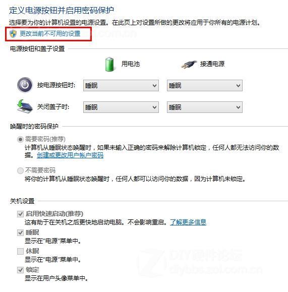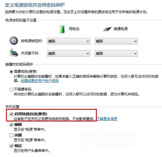 4、在如下界面,之前无法选择的选项已经可以更改,可以看到“启用快速启动(推荐)”选项(系统默认开启),我们可以在此设置是否开启或者关闭此功能。