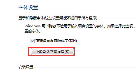 3.一进入更改字体设置的页面,大家就可以再上面看到一个长长的按钮,正是我们要寻找的“还原默认字体设置”,想要还原的朋友,直接点击一下这个按钮即可。