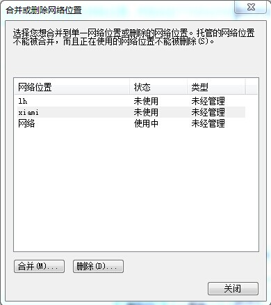 最后,在win7系统下载弹出的合并或删除网络位置窗口中,选择要合并或删除的网络位置,然后点击下方的合并或删除按钮。