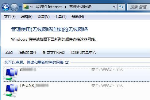 二、打开的网络和共享中心窗口后,在左边窗口中选择“管理无线网络”,然后就会切入一个界面,如下图所示。
