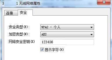 在打开的无线网络属性中,切换到安全标签页,可以看到下面的网络安全密钥,将显示字符勾选起来,即可看到一排密码出现在上面。