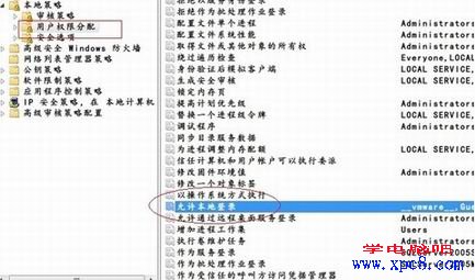 2、打开“本地策略”,点选“用户权限分配”,并在右侧窗口中找到“允许本地登录”。