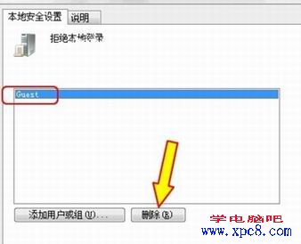 3、双击“允许本地登录”,如果你是在Guest账户下,就在弹出的对话框中选中Guest,然后点击右下部分的“删除”按钮。另外,如果你需要的话还可以把Users都禁止掉,不过,得确定当前用户在Administrator用户组中。
