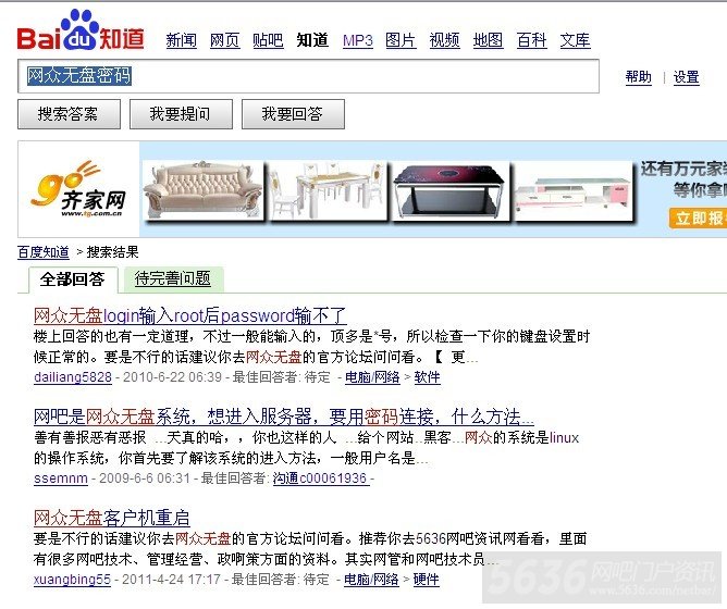最后,网吧无盘想要为大家推荐的方法就是去百度知道里面搜索网众无盘密码,你会发现,那个里面有好多朋友都遇到过或正等待解决网众无盘密码的问题。如下图:如果有你想要的答案,那么,就OK了,