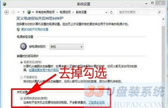 接着关闭“启用快速启动”功能。点击开始按钮找到控制面板并单击然后依次单击电源选项 -> 系统设置 中,找到“关机设置”,去掉“启用快速启动(推荐)”前面的勾选。