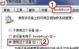 3.在属性窗口中,咱们将界面切换到readyboost这一栏,然后选中下方的“使用这个设备”,点击下方确定退出窗口。