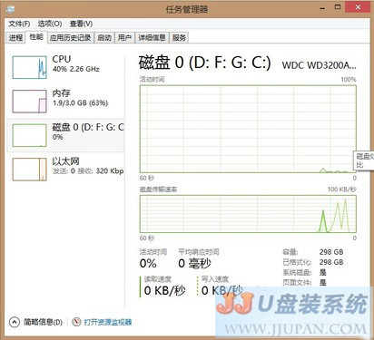 从任务管理器中我们可以看到:在家庭组功能开启后,硬盘会一直读保持写状态。那么下面我们试试关闭家庭组会出现什么变化呢。