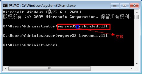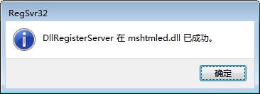 2.在弹出的窗口中输入regsvr32 mshtmled.dll命令回车,这时会提示注册成功,如图: