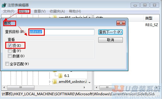 第二步:进入到“注册表编辑器”中,单击菜单栏中的“编辑”选择“查找”,弹出“查找”对话框,在“查找目标”中输入usbstor,只勾选“项”,不要勾选“值”和“数据”可以加快查询速度。然后“确定”,如图: