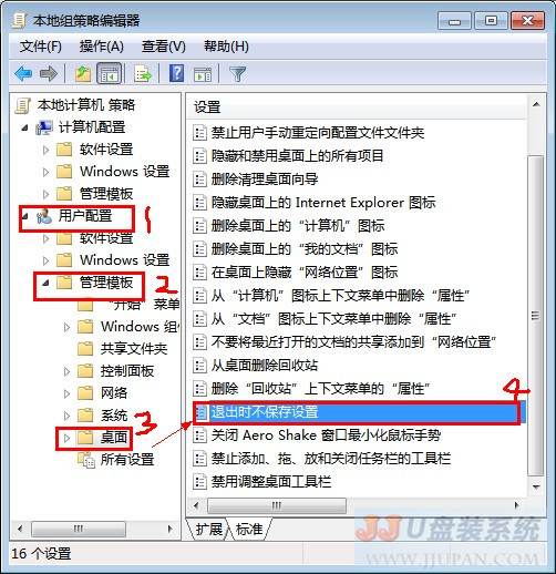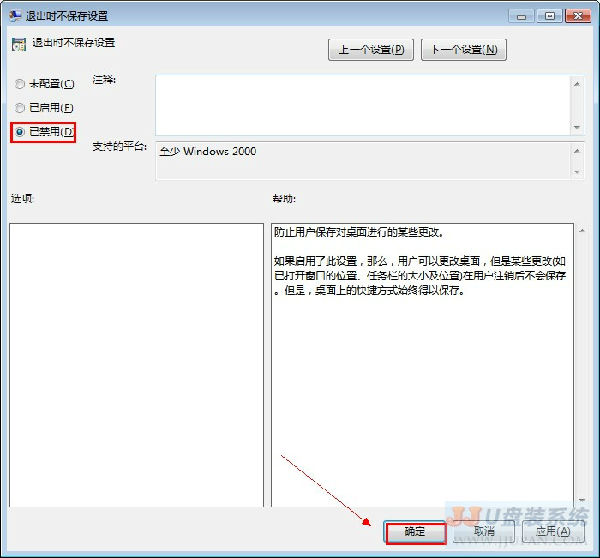 2.进到“本地组策略编辑器”中后,在窗口左侧依次展开【用户配置】--【管理模块】--【桌面】,单击【桌面】在窗口右侧找到【退出时不保存设置】并双击,会弹出一个窗口,将其设置为【已禁用】,然后单击【确定】按钮,如下图。这时再设置桌面即可保存了。