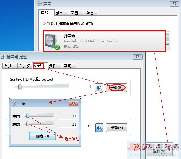 第二步:在弹出的“声音”窗口中,选择你当前正在使用的声音设备图标,然后单击下方的“属性”按钮(注:“属性”按钮默认是灰色的,只有选中了声音设备才转变为可单击状态)。进入到“属性”窗口,选择“级别”标签,然后单击“平衡”按钮;接着会弹出“平衡”对话框,再适当地滑动小滑块,就可以解决影音文件里的“混音”问题了。