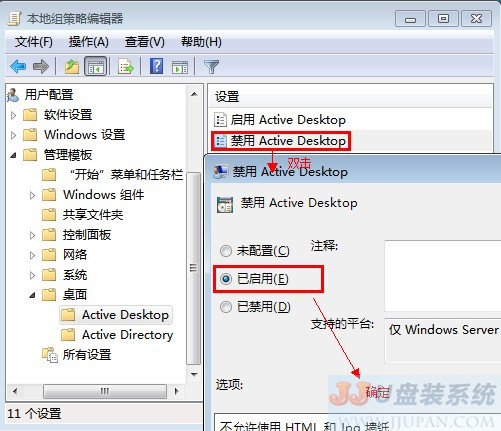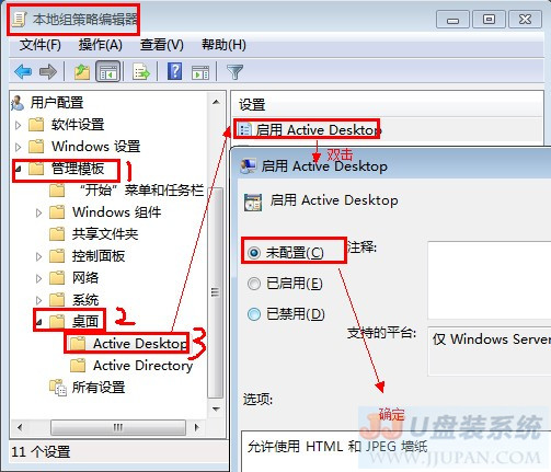 3.点击Active Desktop后在编辑器窗口右部找到”启用Active Desktop”双击,将其设置为“未配置”;并双击“禁用Active Desktop”将其设置为“已启用”。如图: