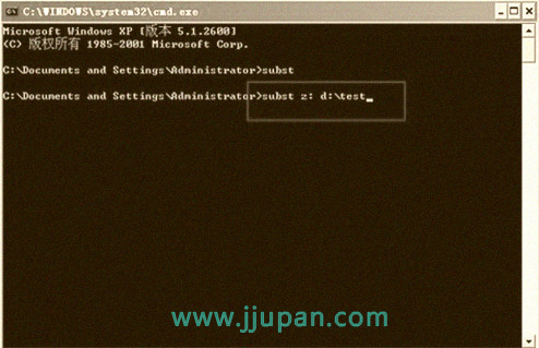 第三步:进到命令提示符窗口后,输入命令subst z:d:test然后回车,就可以把之前在D盘新建的test文件夹虚拟成磁盘分区了(PS: subst是Dos下一个命令,Z:指你要把文件夹虚拟的分区,这个可以自己设置,后面是路径,我创建的test文件夹是在D盘下,如果你创建的文件夹在E盘就改成e:test,文件夹名称也可以自己设定。如果改天你想把该虚拟磁盘分区删除的话,使用Subst/d z:命令即可;删除只是将虚拟的磁盘分区删除,不会对test文件夹以及里面的文件造成引响)。