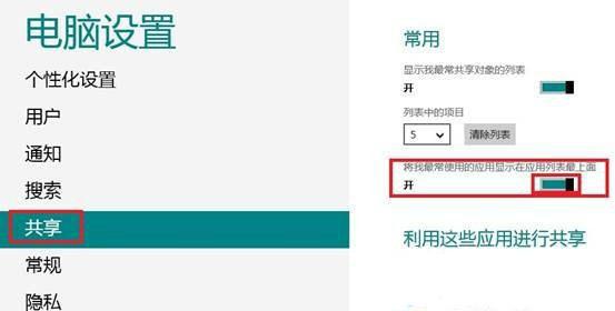 2、来到电脑设置界面之后,直接单击里面的“共享”,然后把右侧的“将我最常使用的应用显示在应用列表最上面”滑块直接关闭就可以了。