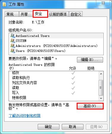 2、在弹出的属性设置窗口中,我们切换到“安全”标签,点击“高级”按钮,如下图所示: