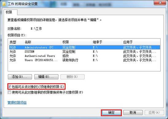4、然后我们只需将高级安全设置窗口中权限里的“包括可从该对象的父项继承的权限”勾选上,点击“确定”,如下图所示: