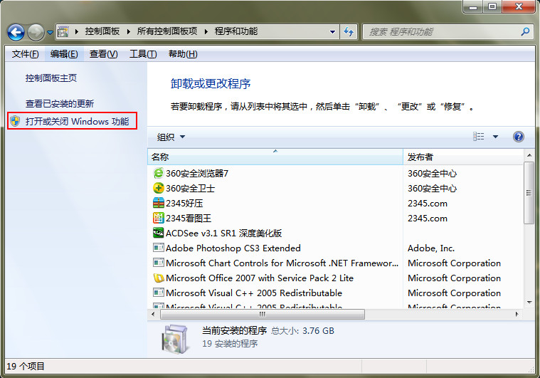 3、在程序和功能窗口中,选择左边的“打开或关闭Windows功能”选项,如下图所示: