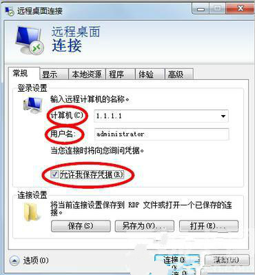 3、此时就会弹出来下面那样的设置框,找到常规选项卡并根据提示要求输进去需要远程登录电脑的ip地址和远程登录的帐号,同时把红框中的选项勾上,接着就单击下面的连接键,然后输入密码,这样就可以顺利进行远程登录电脑桌面操控。