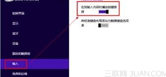 4.接下来还是看左侧的菜单栏,找到输入并单击,然后在右侧边会看到触摸键盘了,然后这里边有设置播放按键音的按钮,至于是选择关闭或者开启,就看大家的需要了!