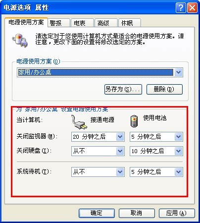 另外还可以在这里为计算机设定将系统切换至休眠状态前所需等待的时间。所设定的时间应不超过电池运行时间。设定方法是在【电源是要方案】选项卡上,设定【电池运行状态】下的系统休眠等待时间。