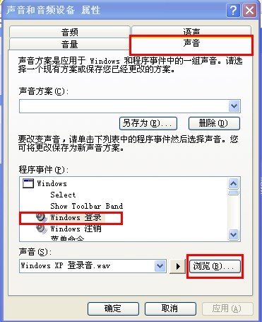 2: 在打开的“声音”窗口中切换到“声音”选项卡,在“程序事件”一栏中选择“Windows登录”选项,下面的“声音”对话框中会出现系统默认的音乐,单击“浏览”按钮,选择自己喜欢的音乐,这时可以点击“浏览”前那个按钮进行试听,如果合适的话就可以应用了。