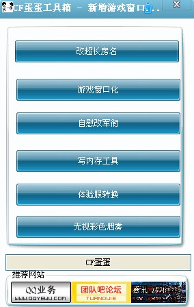 CF蛋蛋工具箱是一款绿色免费的由玩家蛋蛋制作的CF穿越火线的辅助工具。软件功能强大,安全稳定,免除玩家被封号的风险,支持改超长房名、游戏窗口化以及自慰改军衔、体验服转换等等功能。