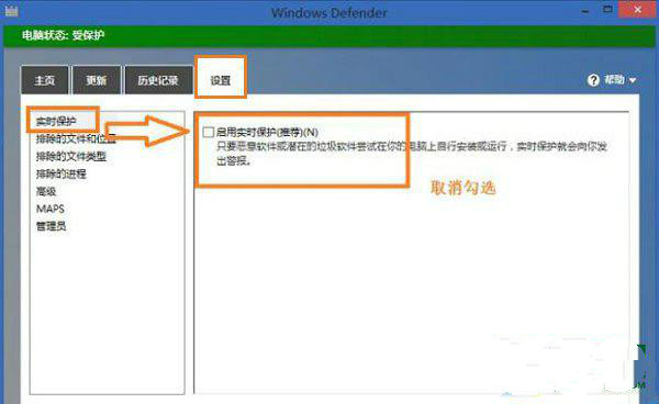 2、组合键win+Q将搜索框打开,在框框里面输进去“Windows Defender”并点击回车键,这时候就会弹出来一个Windows Defender窗口,在窗口里面单击“设置、实时保护”,同时将“启用实时保护(推荐)”前面的勾勾去了,接着就直接将更改保存。如图: