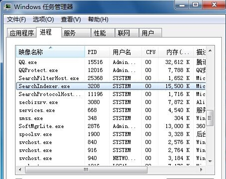 步骤四:最后一部就是在键盘上同时按下Ctrl键+Shift键+Esc键,呼出任务管理器,在任务管理器的进程中,找到searchindexer.exe服务功能,鼠标右键单击该功能,点击“打开文件位置”项,然后将它删除。