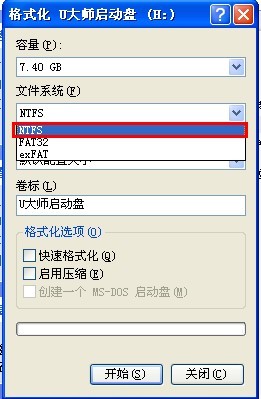 2.在弹出的格式化窗口中,在“文件系统”下拉框中选择”NTFS“,如图: