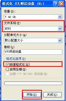 3.勾选”快速格式化“,单击”开始“按钮,进行格式化操作,如图: