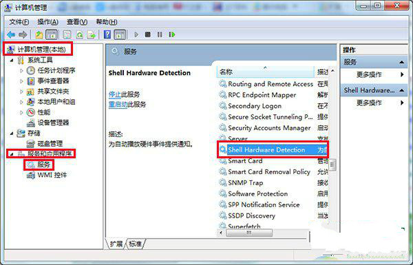 2、左键点击计算机管理,同时再打开服务和应用程序,接着点击选择服务项,然后在里面找到“Shell Hardware Detection”,如图: