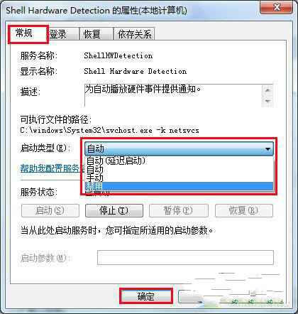 3、左键双击“Shell Hardware Detection”选项,就会出现属性,此时找到常规选项卡,将里面的启动类型修改一下,使其禁用就可以,接着点击“确定”按键钮,如图: