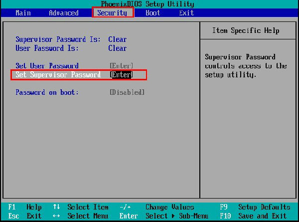 2.使用方向键选择“Security”项,使用方向键移动到“Set User Password”回车,如图: