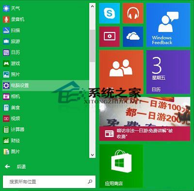 点击开始按钮,在菜单中点击“所有应用”,然后在里面找到并点击“电脑设置”。