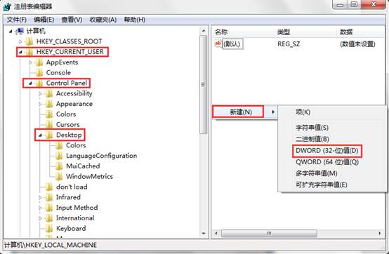 二、接着依次展开到HKEY_CURRENT_USER→Control Panel→Desktop,然后在空白处单击右键,新建一个“DWORD 32位值”,如下图所示: