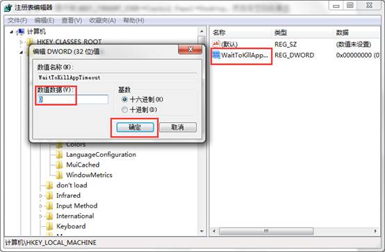 三、把新建的值重命名为 “WaitToKillAppTimeout”后,双击打开,接着把数值数据修改为0即可。如下图所示:
