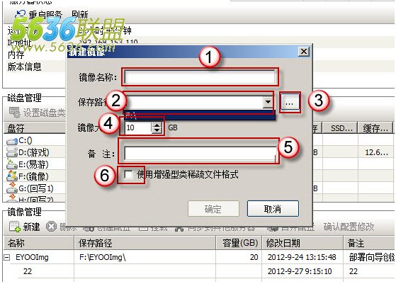 4. 然后选择镜像大小(一般20G),填写备注(方便区分镜像),勾选使用增强稀疏文件格式,点击“确定”按钮,新建就完成了。