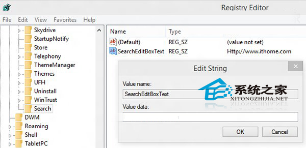 若想恢复默认文字,使用同样方法将“Search the Web and Windows”输入SearchEditBoxText中即可。