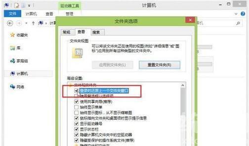 2、在下图所示的窗口里面找到高级设置列表,然后在里面找到“登陆时还原上一个文件夹窗口”选项,把这个选项前面打上小勾勾,然后直接点击下面的确定按键,退出返回到系统桌面。