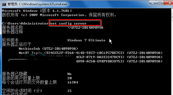 2.接下来咱们在窗口中输入net config server并单击回车,这样,就可以查询到本地服务器上可配置的服务信息了。