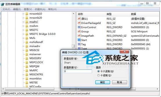 2.在“注册表编辑器”窗口中,依次点开“HKEY_LOCAL_MACHINE/System/CurrentControlSet/Services/Msahci项,选中Msahci项,在右边窗口中双击名称为“Start”的项目,会弹出一个对话框,将默认的数值数据由3更改为0,点击“确定”,重新启动电脑。