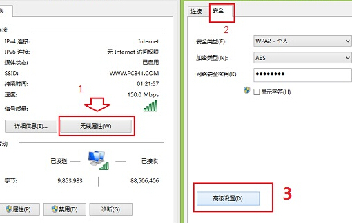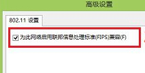 步骤三:在状态查看完毕之后,我们点击中部的“属性”按钮,然后在属性窗口中切换到“安全”选项卡,点击“高级设置”进入设置窗口,在新打开的802.11设置窗口中,我们能够看到一个“为此网络启用联邦信息处理标准”的选项,我们把这个选项前方的复选框勾选上,然后确定进行保存。