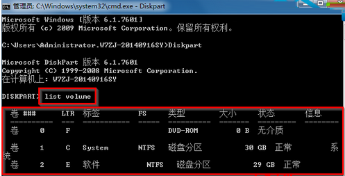 2.在窗口中,咱们直接输入代码diskpart并单击回车,等待系统反应完毕之后,再次输入代码list volume并单击回车,这样,系统中所有分区的详细信息就会一一的显示出来了!