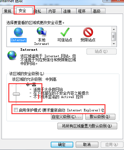 2.在弹出来的Internet选项窗口中,咱们切换到安全这一栏,然后将下方的“启用保护模式”勾选上,而上方的拉动条,咱们往下拉,将安全级别降低。