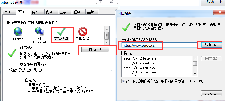 3.接下来点击上方的信任站点,然后双击打开的窗口中,将自己需要打开的网站输入到“将该网站添加到区域”的方框中,点击后面的添加按钮。最后点击确定保存设置即可。